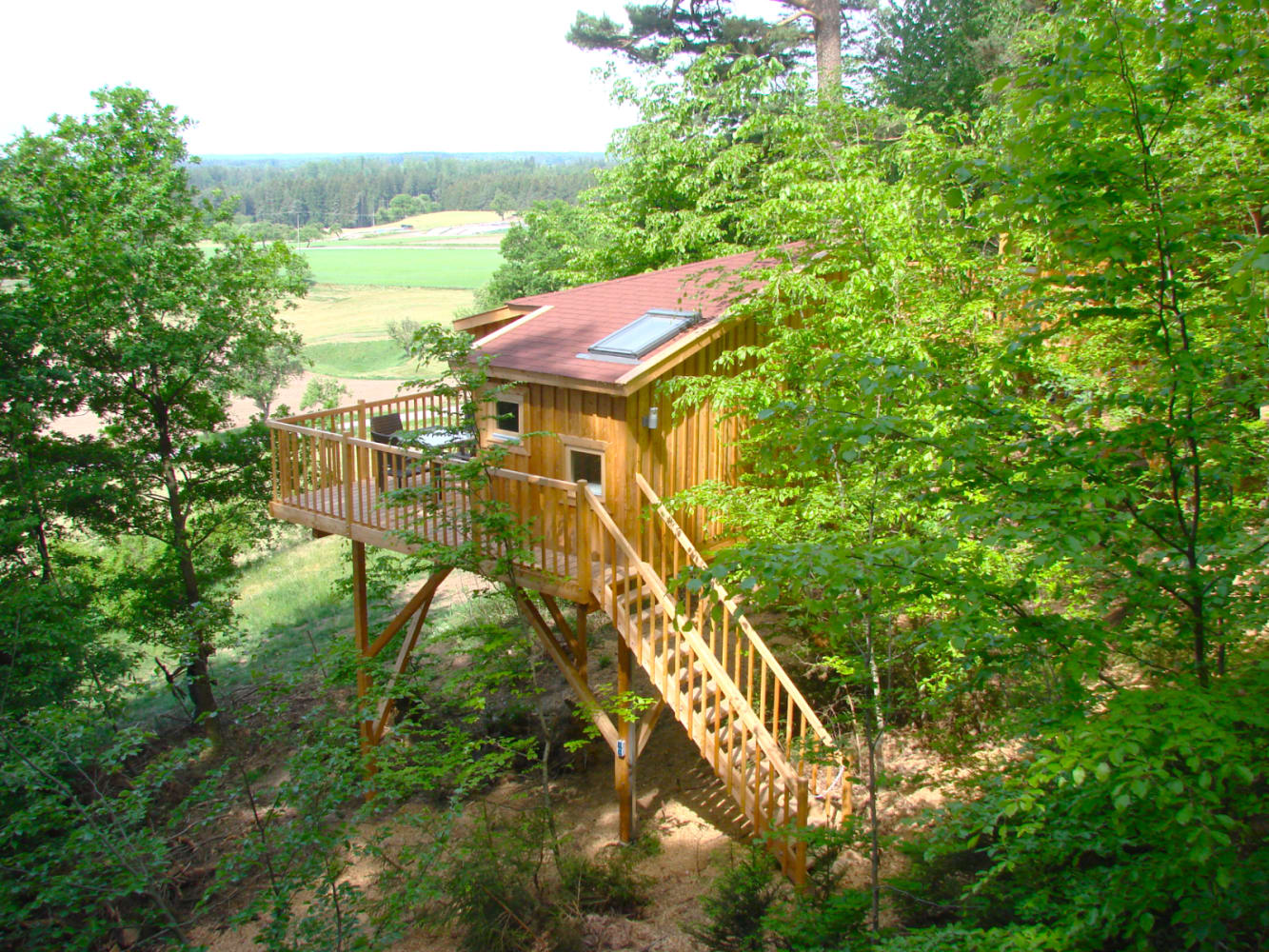 Du wohnst in einem unserer liebevoll gebauten Baumhäuser am Waldrand – mit Terrasse, Sonne, Holz und jeder Menge Raum zum Durchatmen. Morgens bekommst du auf Wunsch ein Frühstückskörbchen direkt vor die Tür geliefert. Abends könnt ihr gemeinsam am Lagerfeuer sitzen, den Grill anwerfen oder einfach den Sonnenuntergang genießen. Wer Lust hat, erkundet die Natur: Wandern, Biken, Baden – Natur ist hier der schönste Spielplatz.