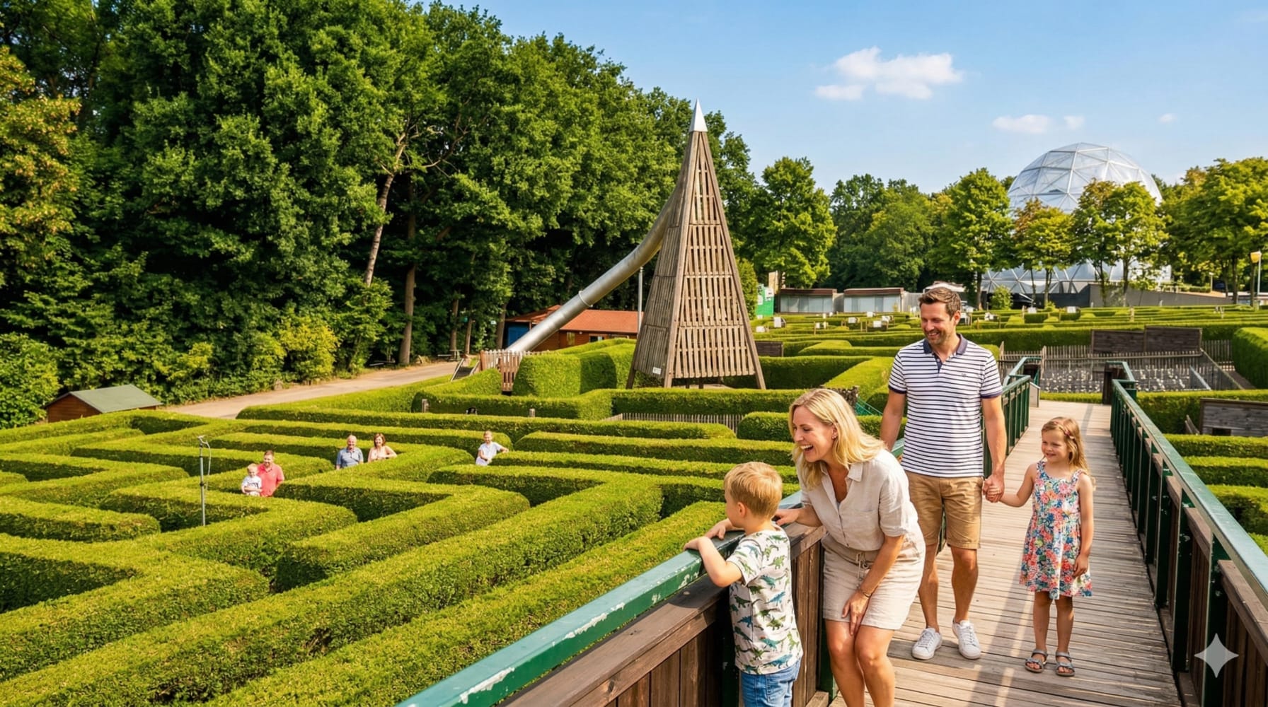 Das große Herzstück bildet ein Heckenirrgarten, der mit seinen zahlreichen Wegvarianten eine besondere Herausforderung bietet. Im Abenteuerlabyrinth gilt es zudem, verschiedene Hindernisse wie wackelige Brücken oder Palisaden zu überwinden, die für Bewegung und Freude sorgen. Wer es ruhiger mag, findet im Rätsellabyrinth die Möglichkeit, sein Wissen anhand von spannenden Fragen zu prüfen.