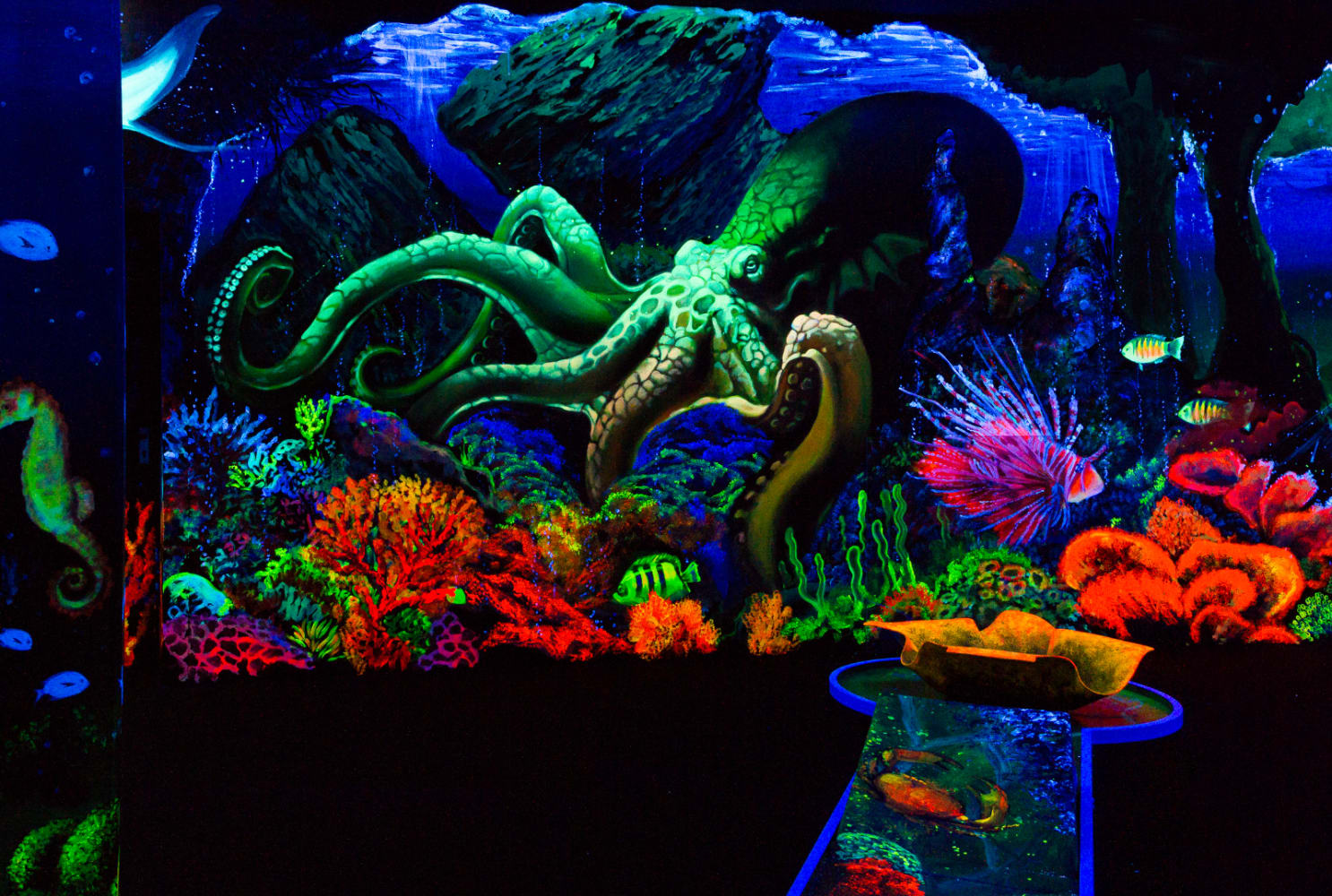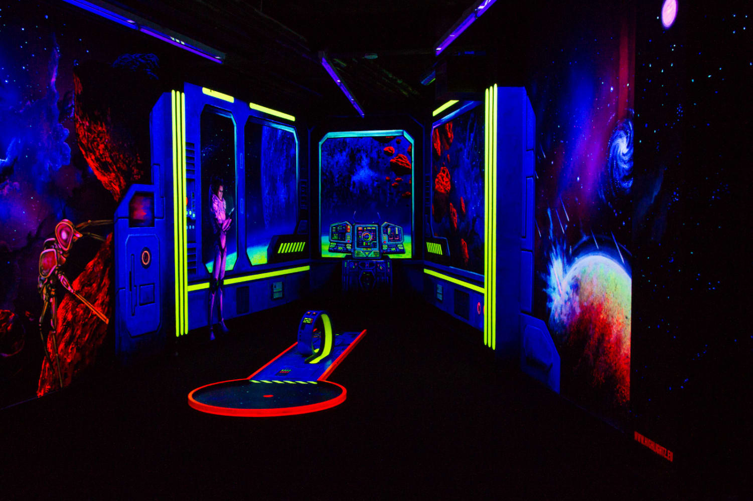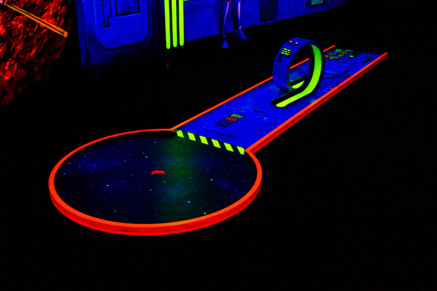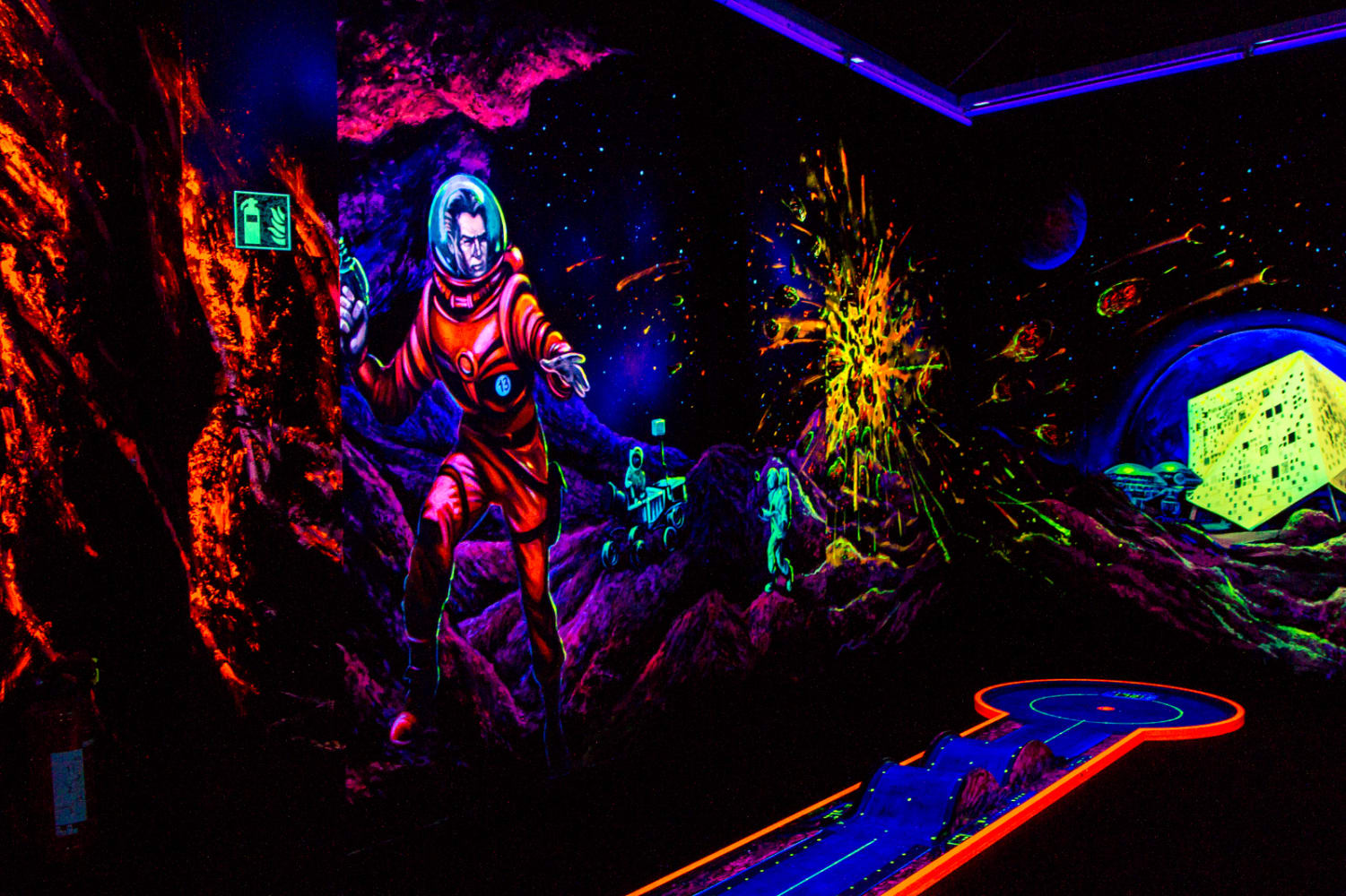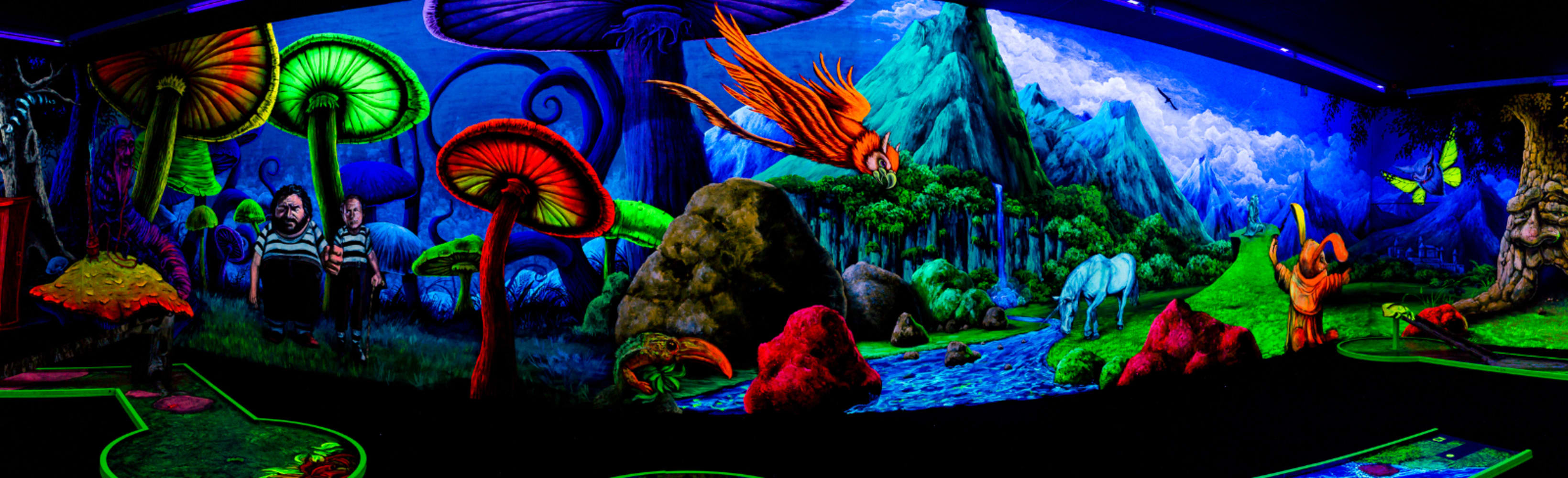 Tauchen Sie ein in eine faszinierende Welt aus leuchtenden Farben und beeindruckenden 3D-Effekten bei Simigolf Schwäbisch Gmünd. Auf über 500 Quadratmetern erwartet Sie ein einzigartiges Indoor-Minigolf-Erlebnis, das sowohl Kinder als auch Erwachsene begeistert. Die 18 abwechslungsreichen Bahnen führen durch fantasievolle Themenwelten, die unter Schwarzlicht in lebendigen Farben erstrahlen und ein unvergessliches Spielerlebnis garantieren.
